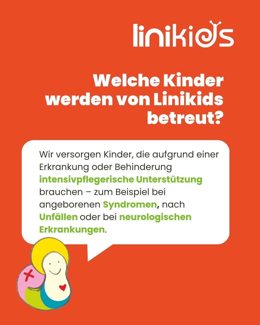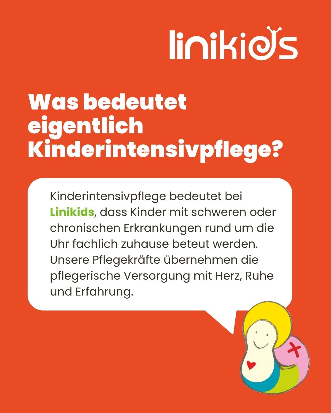 Unsere Aufgabe ist es, die Kinder sicher zu begleiten, ihre Entwicklung zu fördern und den Familien im Alltag Entlastung zu geben. Wir übernehmen die Überwachung wichtiger Körperfunktionen, die Versorgung von Beatmungstechnik, die Behandlungspflege und unterstützen beim Spielen, Lernen und Großwerden.